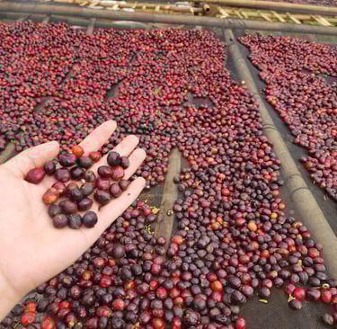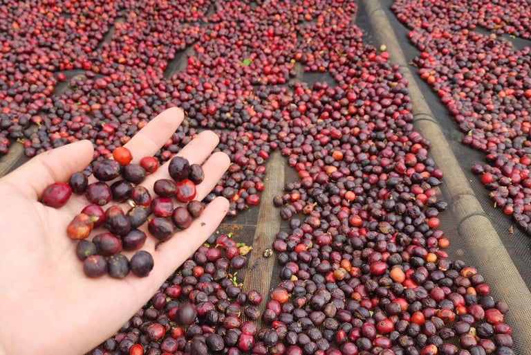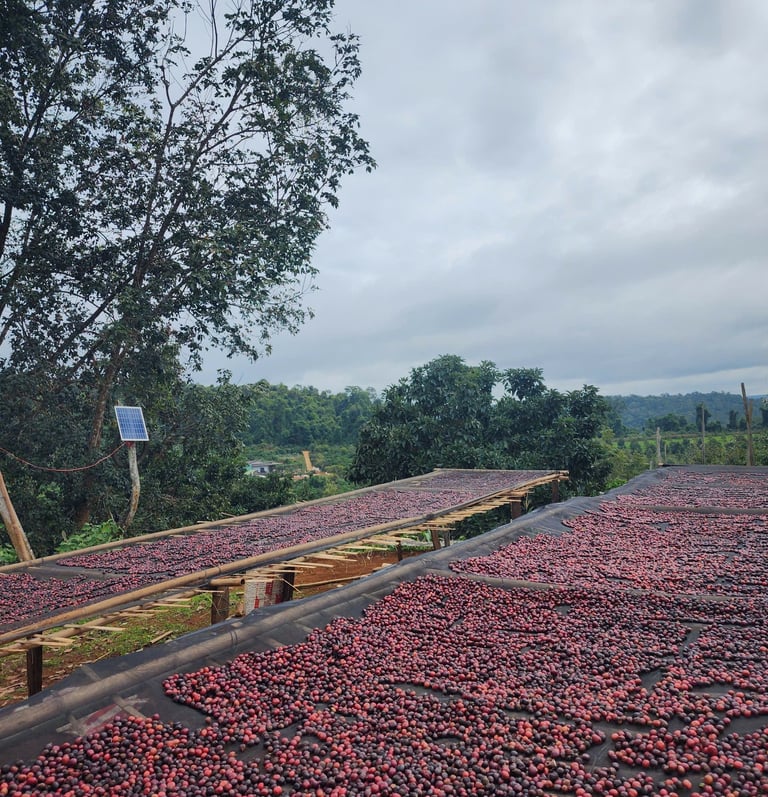 Hành trình bắt đầu từ trang trại cà phê Rovie , nơi con người học cách làm việc cùng Mẹ thiên nhiên thay vì can thiệp quá mức. Mỗi mùa thu hoạch, chỉ những trái cà phê chín đạt độ hoàn thiện mới được lựa chọn, đảm bảo hương vị tròn đầy ngay từ khâu đầu tiên. Sau thu hoạch, cà phê được sơ chế theo phương pháp Natural (khô tự nhiên), được phơi trên giàn, hấp thụ nguồn nắng và gió trời để hạt cà phê phát triển hương vị một cách chậm rãi và tự nhiên nhất.