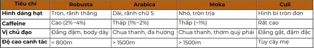 PHÂN BIỆT ARABICA – ROBUSTA – MOKA – CULI: BẢN ĐỒ HƯƠNG VỊ CÀ PHÊ VIỆT