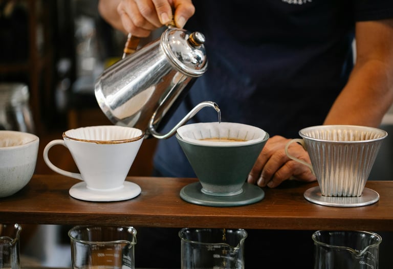 Kiểm soát dòng rót: Dùng ấm rót cổ ngỗng (Gooseneck Kettle) là bắt buộc để kiểm soát dòng nước chính xác từng milimet.